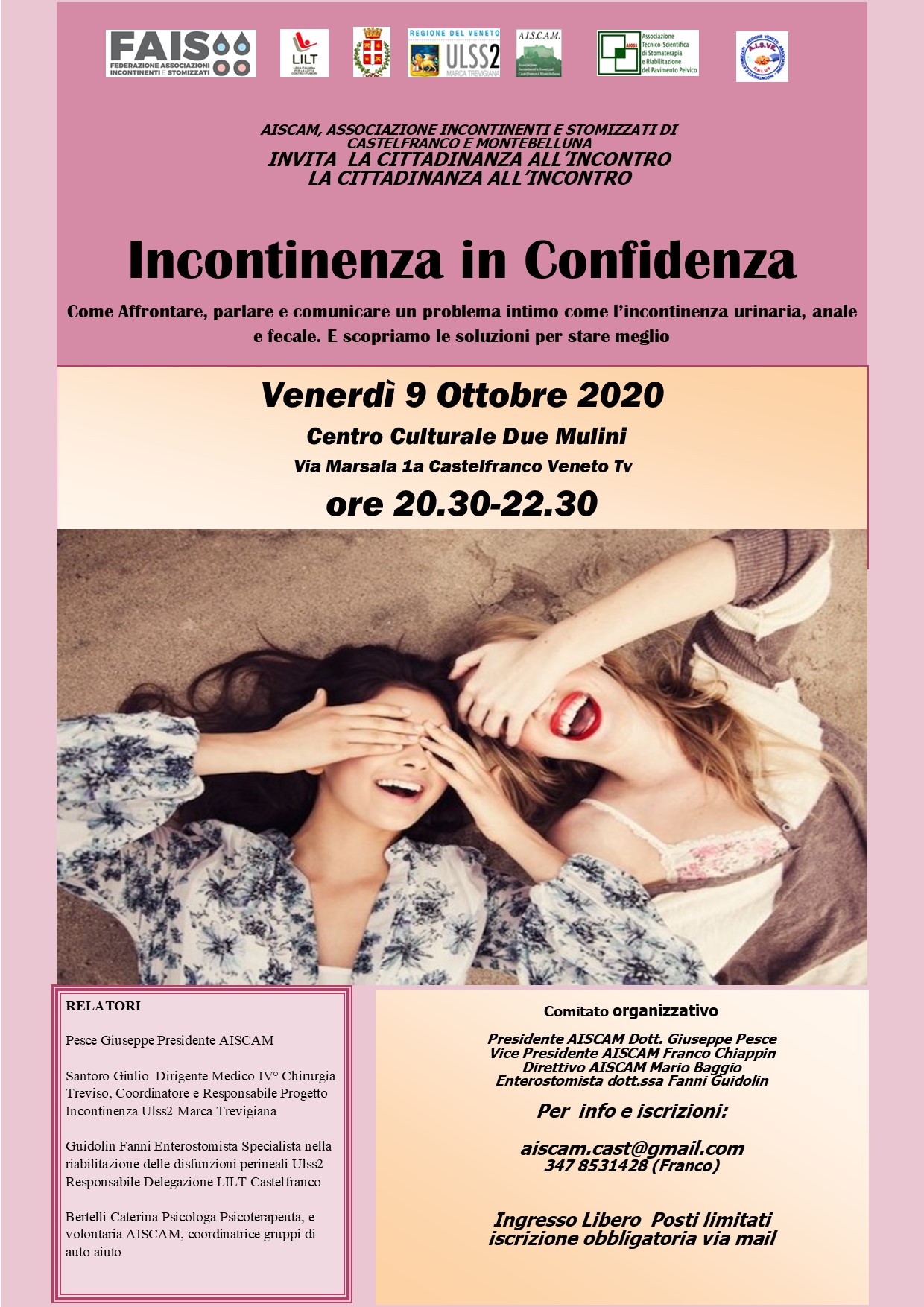 Ci ospiterà il Centro culturale Due Mulini, venerdì 9 Ottobre a Castelfranco Veneto per una serata di sensibilizzazione sul tema dell’incontinenza. L’iscrizione è obbligatoria via mail: aiscam.cast@gmail.com poichè, causa normativa anti Covid, i posti saranno limitati.